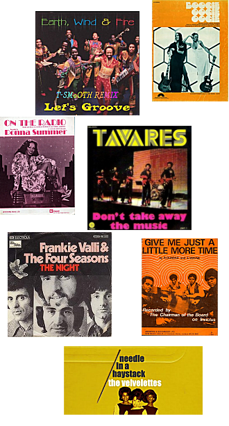 NORTHERN SOUL A Lovers' Concerto (The Toys) Band Of Gold (Freda Payne) Be Young, Be Foolish, Be Happy (The Tams) Cool Jerk (The Capitols) Do I Love You (Frank Wilson) Getting Mighty Crowded (Betty Everett) Give Me Just A Little More Time (COTB) Love Really Hurts Without You (Billy Ocean) Out On The Floor (Dobie Gray) Red Light Spells Danger (Billy Ocean) Tainted Love (Gloria Jones) The Night (Frankie Valli) The Snake (Al Wilson) Turning My Heartbeat Up (The MVPs) SOUL Higher And Higher (Jackie Wilson) Hold Back The Night (The Trammps) Knock On Wood (Eddie Floyd) Land Of A 1000 Dances (Wilson Pickett) Midnight Hour (Eddie Floyd) Shake A Tail Feather (Ray Charles) Sweet Soul Music (Arthur Conley) DISCO & FUNK Boogie Oogie Oogie (A Taste Of Honey) Don't Take Away The Music (Tavares) Let's Groove Tonight (EWF) On The Radio (Donna Summer) |